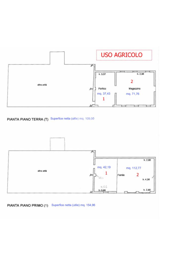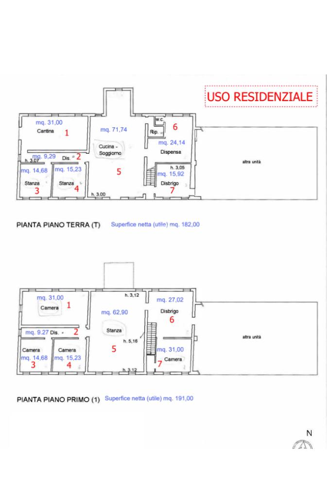 Piano terra con soggiorno e cucina di 71 mq, cantina, dispensa e locali di servizio;Piano primo con 4 camere, stanze aggiuntive e disimpegni.